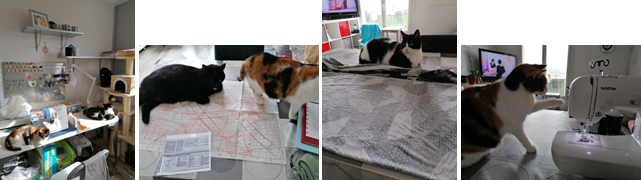 Gypsi, Arka et Minette au soleil dans mon ancienne salle de couture / Gypsi qui m'aide à relever un patron/ Arka qui m'aide à tenir mon tissu/ Minette qui m'aide pour enfiler la machine à coudre
